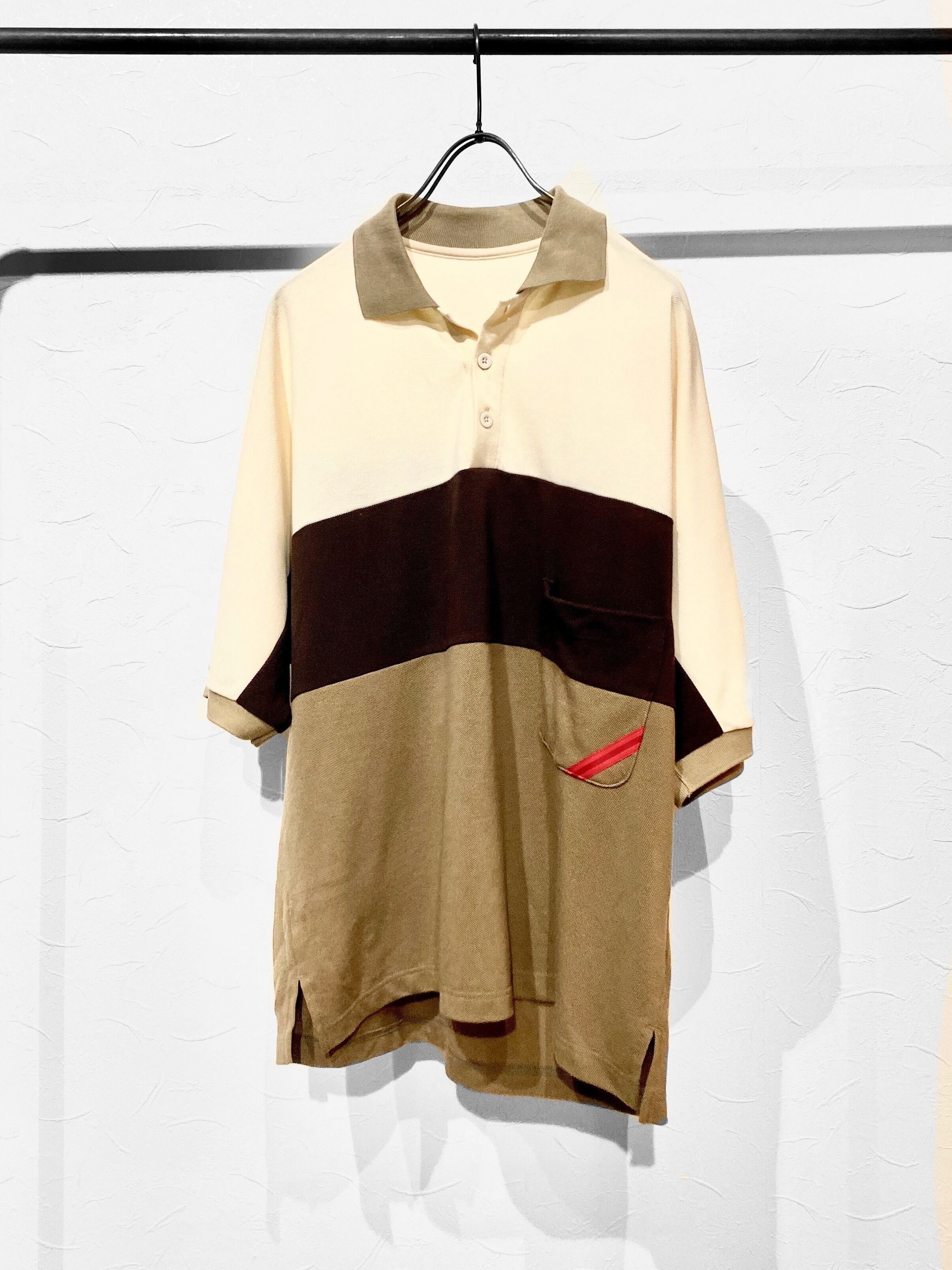 ポロシャツにはして身幅が広いゆったりとしたラグラン&ドルマンスリーブシルエットにトリコロールカラーの切り替えが特徴的な1着