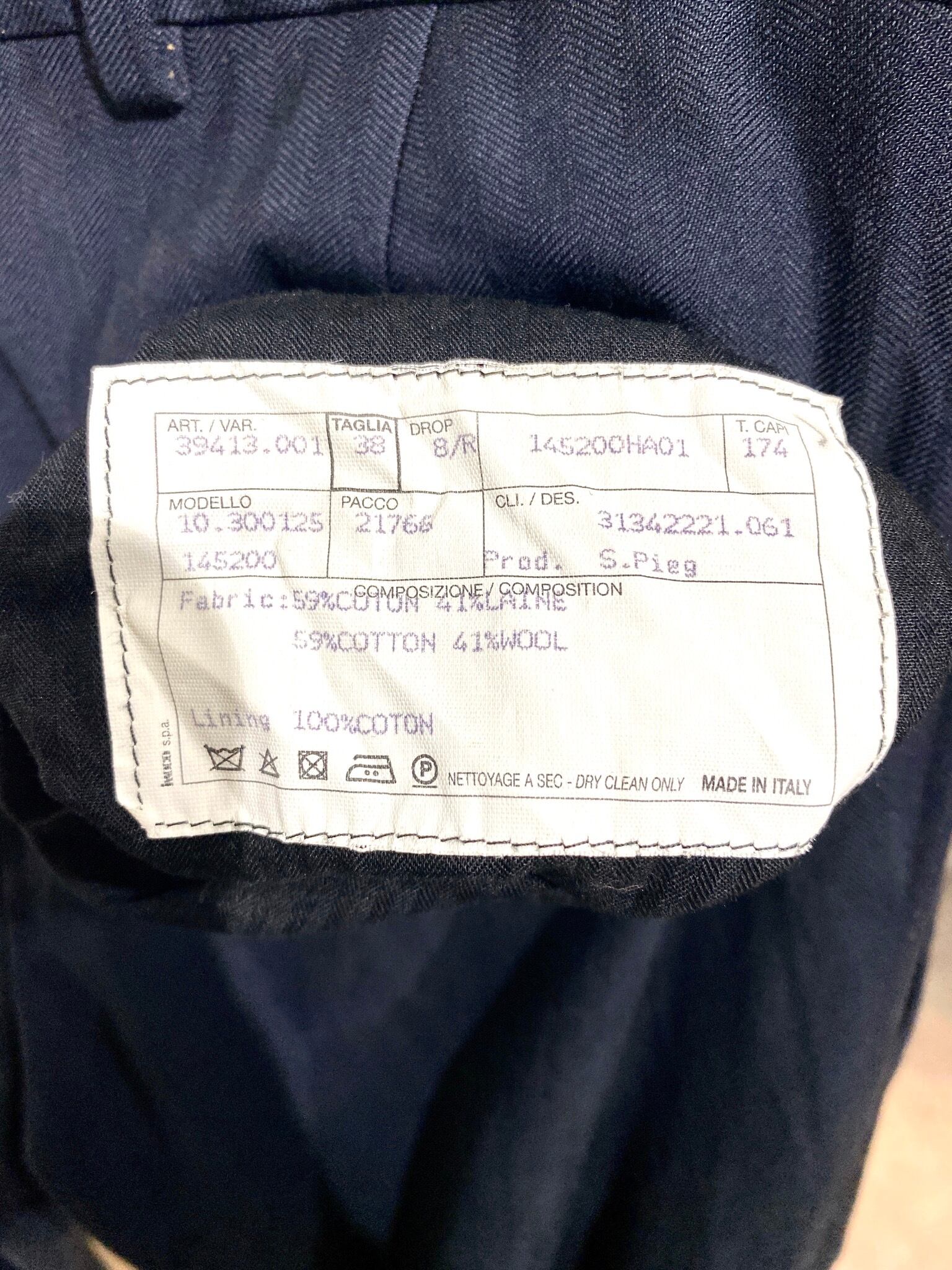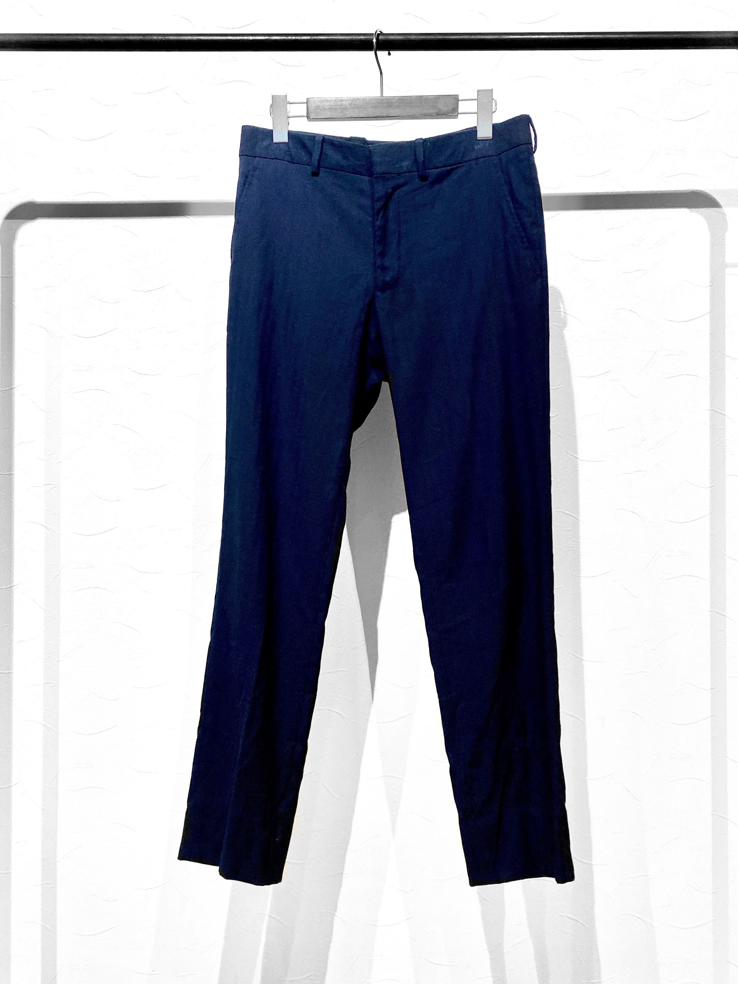 ネイビーのヘリンボーン生地のテーパードがきいた細身のパンツ