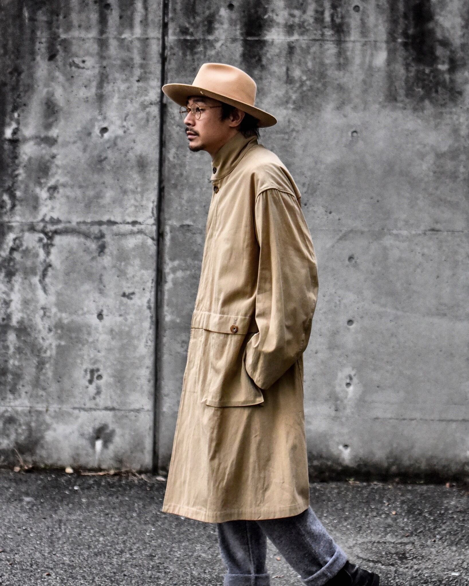 ヴィンテージライクなシャリっとしたベージュのコットン地に大きなフロントポケットと襟のデザインが特徴的な一枚