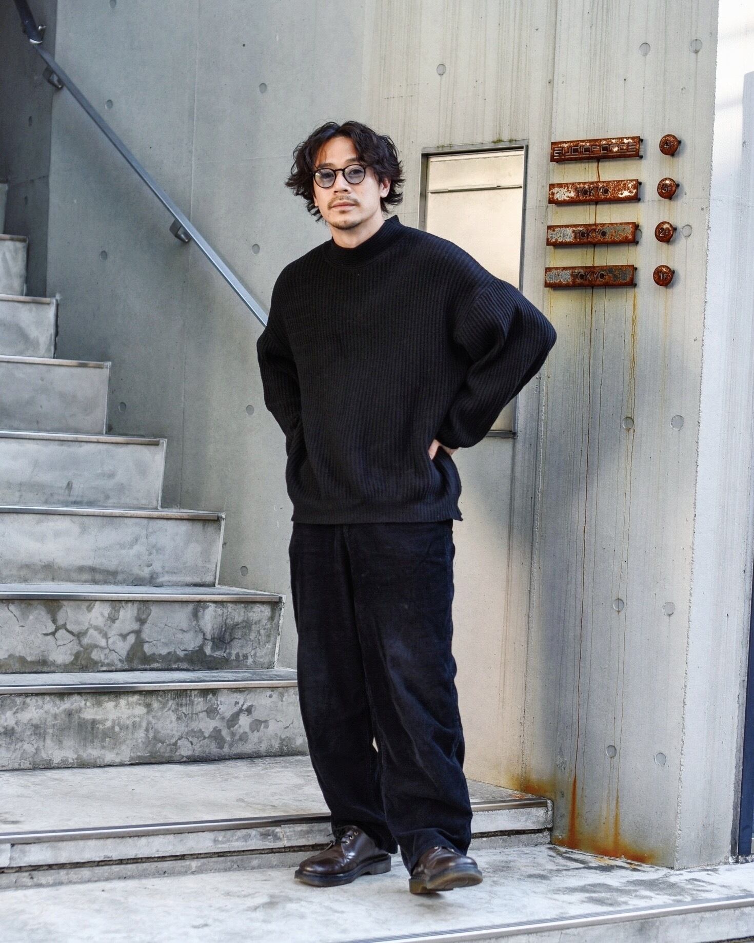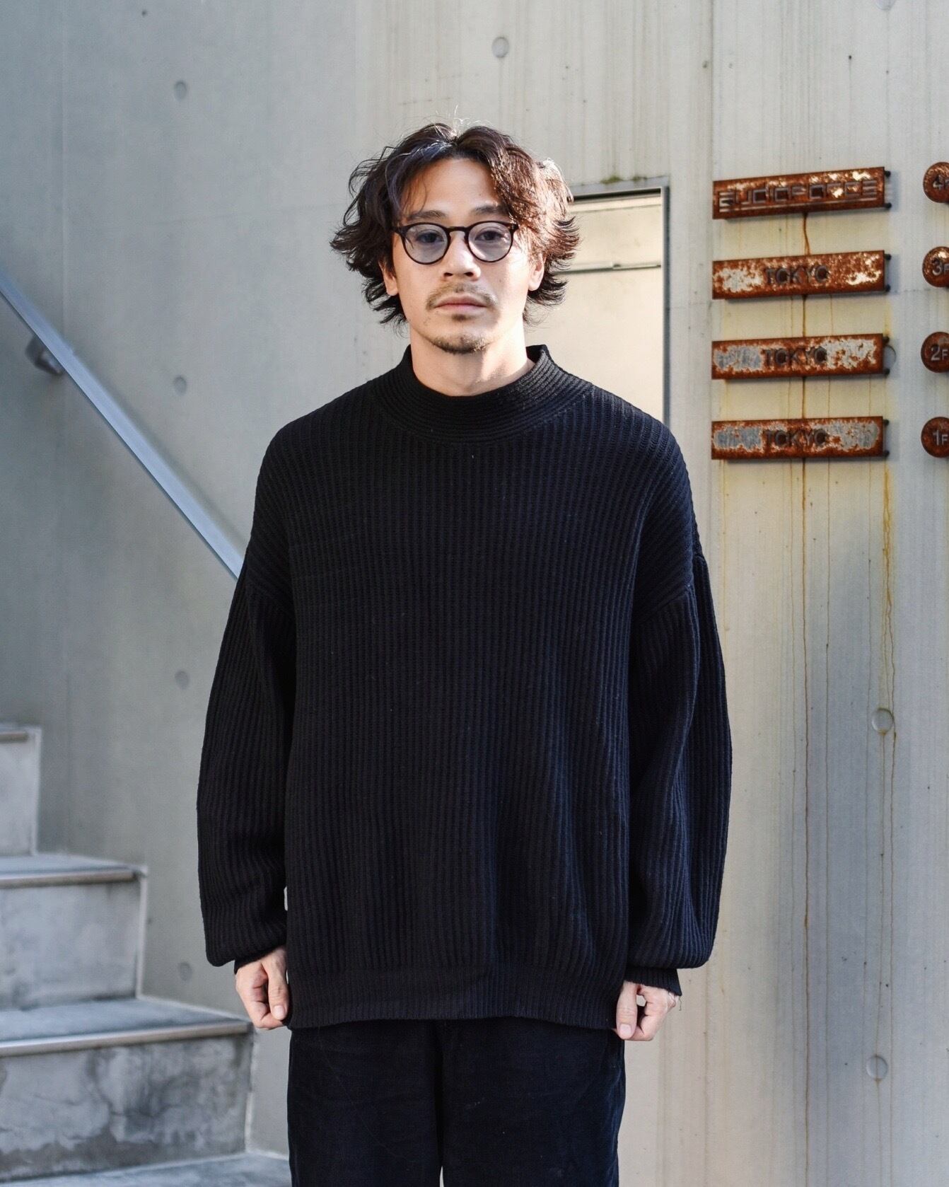 カシミア&ウールの柔らかな肌触りにモックネックのデザイン、リブ編みで身幅の広いユニセックスでゆったりと着られるデザイン