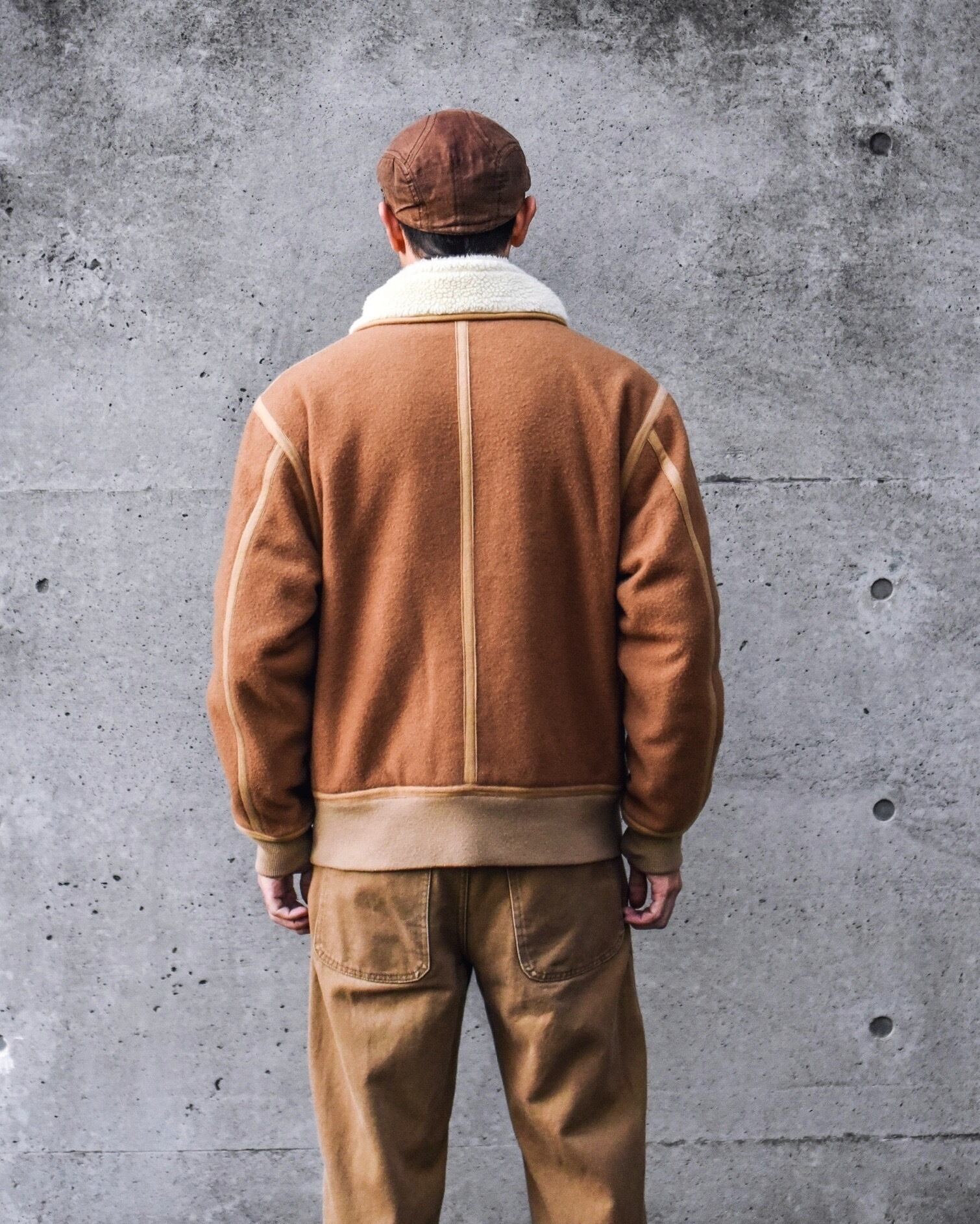キャメルの色味のウールのメルトン生地をベースに襟が白のボア切り替えになったデザインのジップジャケット