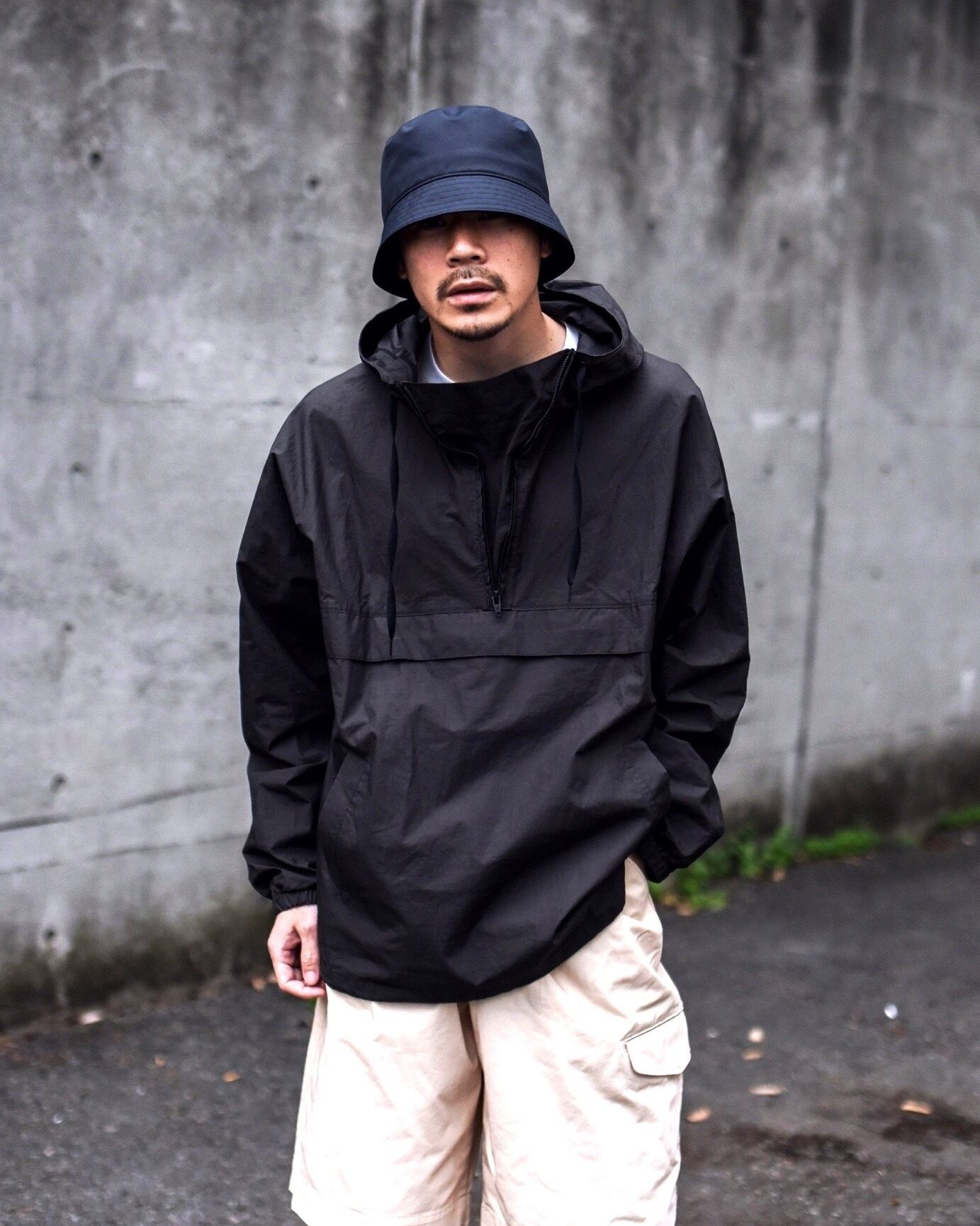 一般的なアノラックパーカーよりもよりシンプルでスタイリッシュなデザインとなっており、あまりカジュアルな雰囲気が出過ぎずに着られるアイテム。