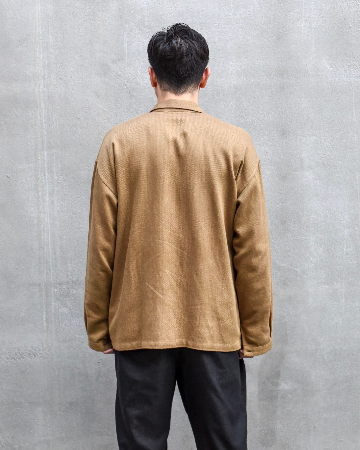 ベースはワークシャツのデザインでレーヨンならではの落ち感とリネン特有のドライでヴィンテージのような風合い。さらにシルクの品のある表情を合わせて持ったワークだけどラグジュアリーな表情。