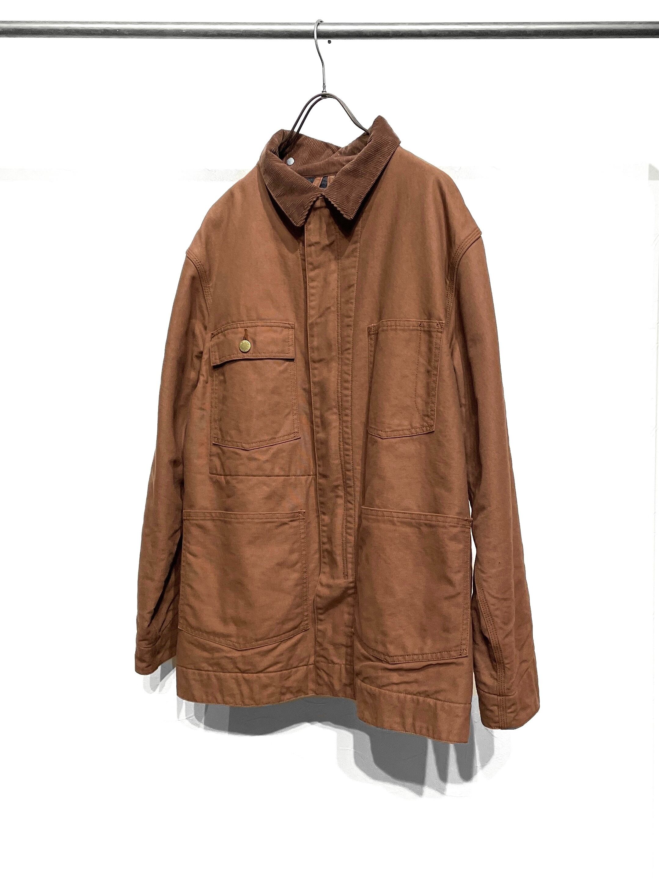 ブラウンの色味のコットンのダック生地を使用したワークテイストのカバーオールジャケット。