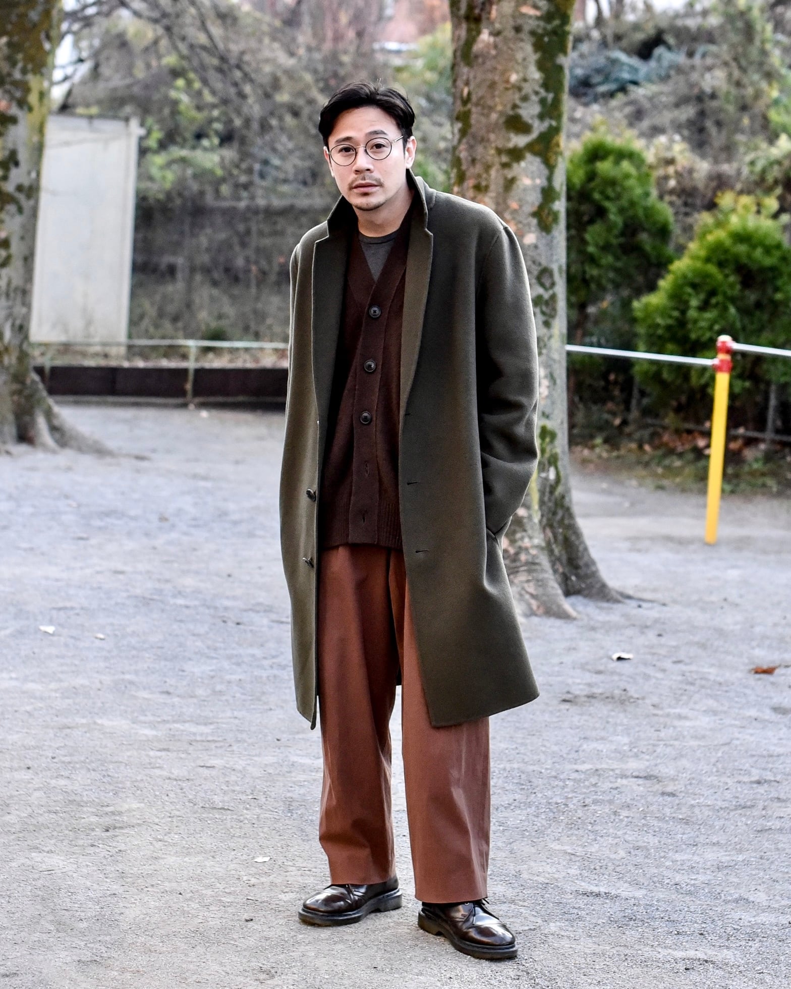 また身幅も広いオーバーサイズのシルエットで中にもレイヤードがしやすく普通のチェスターコートよりも着こなし幅が広く、色味もオリーブなので古着などとも合わせやすいです。