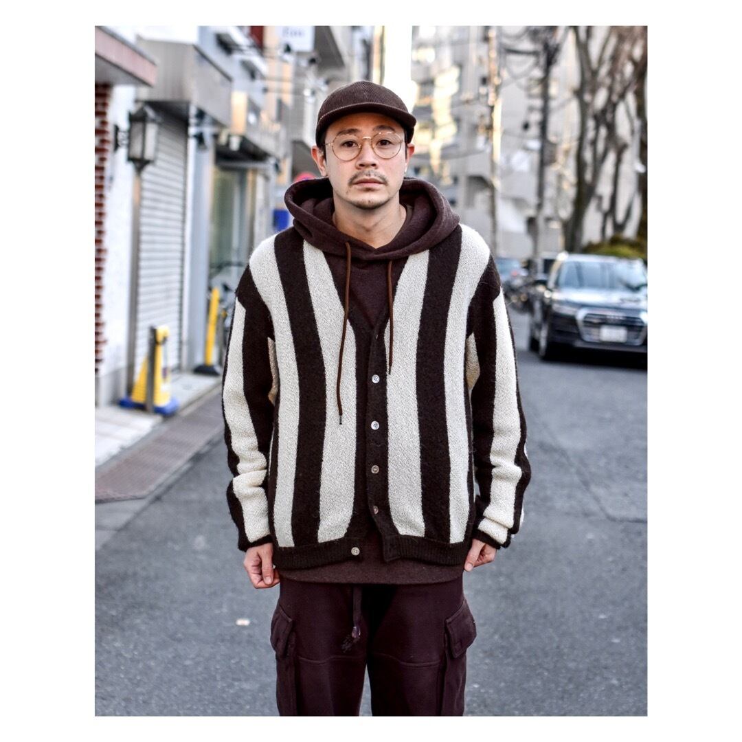 珍しいアルパカ100%のブラウン&ホワイトのストライプ柄のニット地を使用したカーディガン。