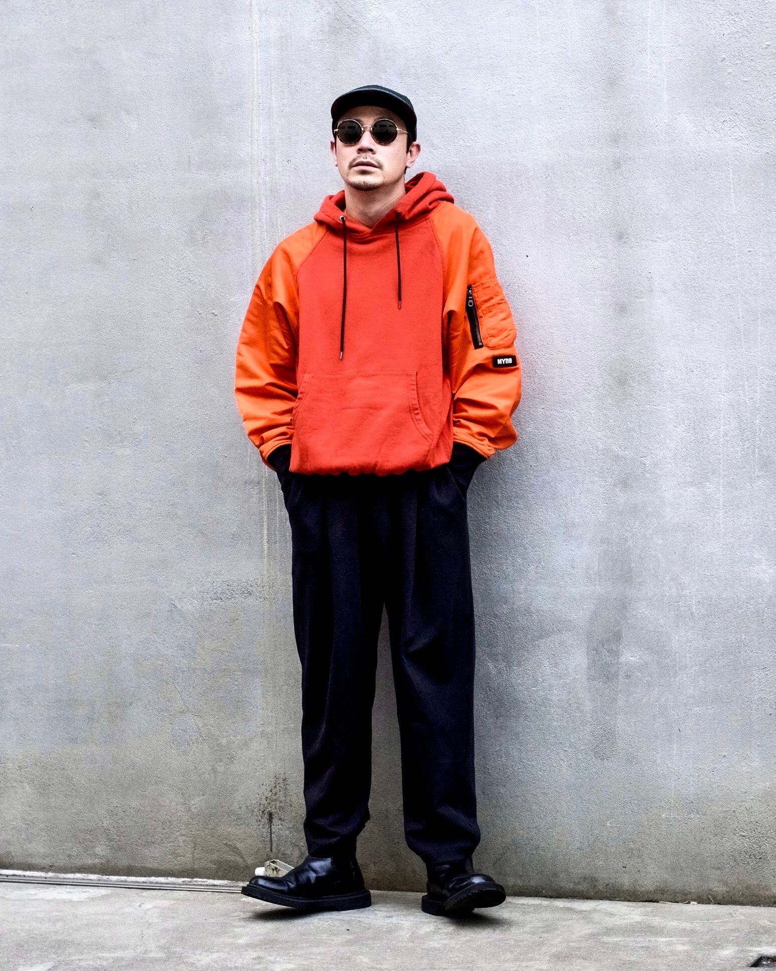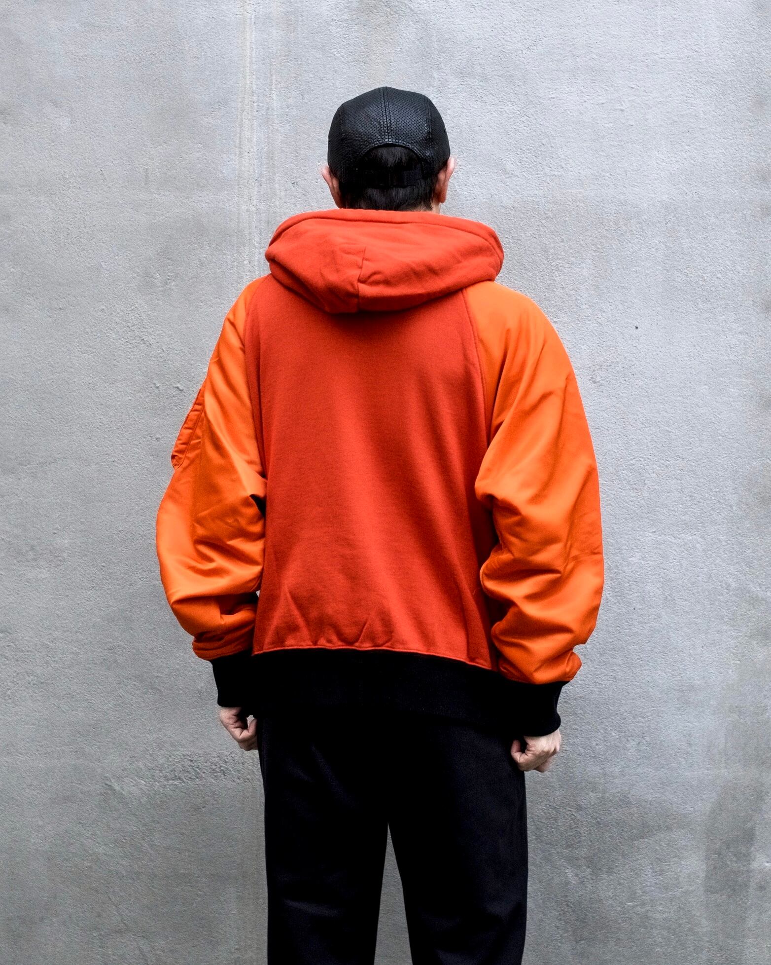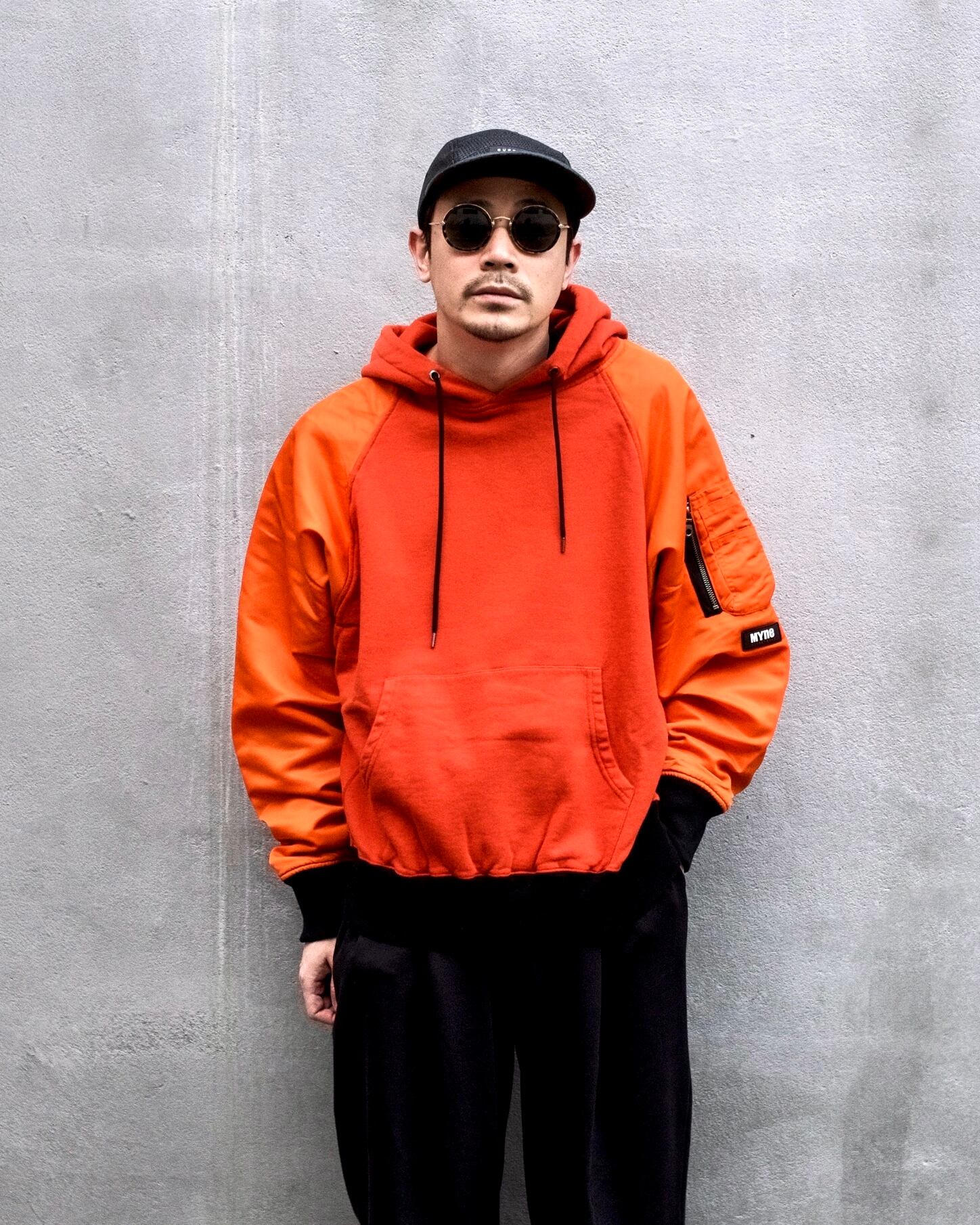 ベースはオレンジのスウェットパーカーですがスリーブがMa-1になっているのでアウター感の強いデザインで一枚で着ていただいても主役になるようなデザイン。