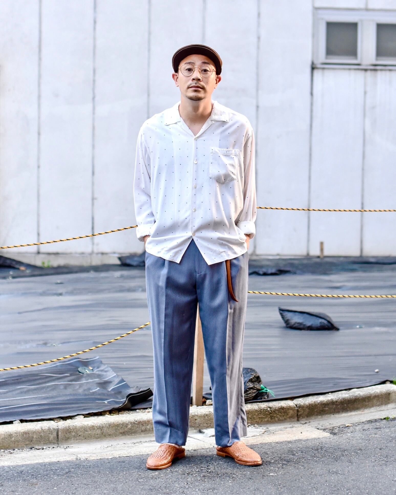 UNUSEDのスクエアドット柄のレーヨン素材のオープンカラーシャツ。