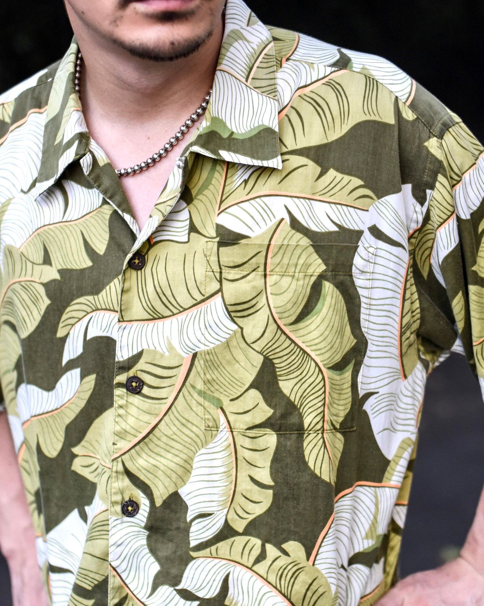 普通のアロハシャツとは違いアウトドアブランドならではのリーフ柄でサファリっぽい雰囲気が◎。
