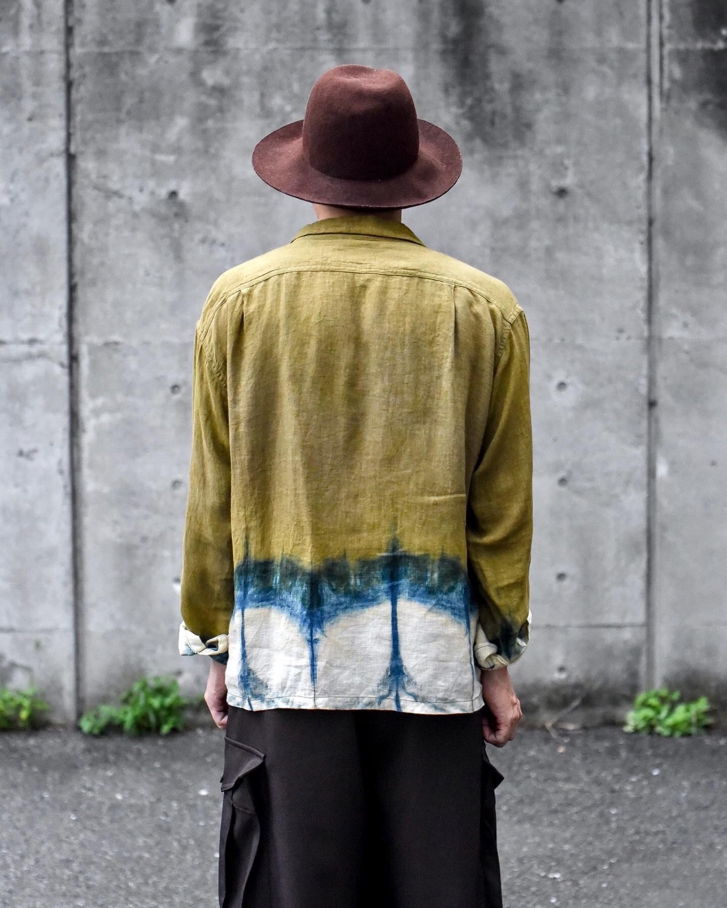 STORY mfg.のインド製のオーガニックリネンを使用したムラ染デザインのオープンカラーシャツ。