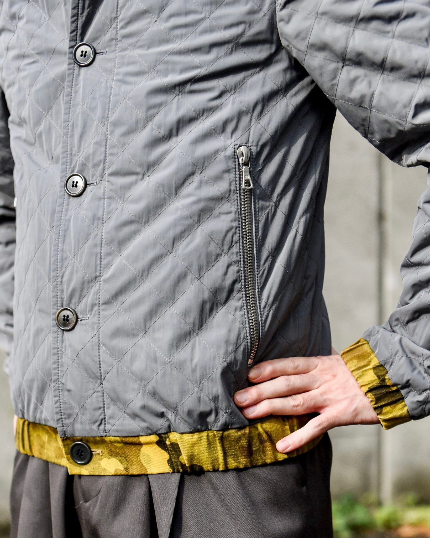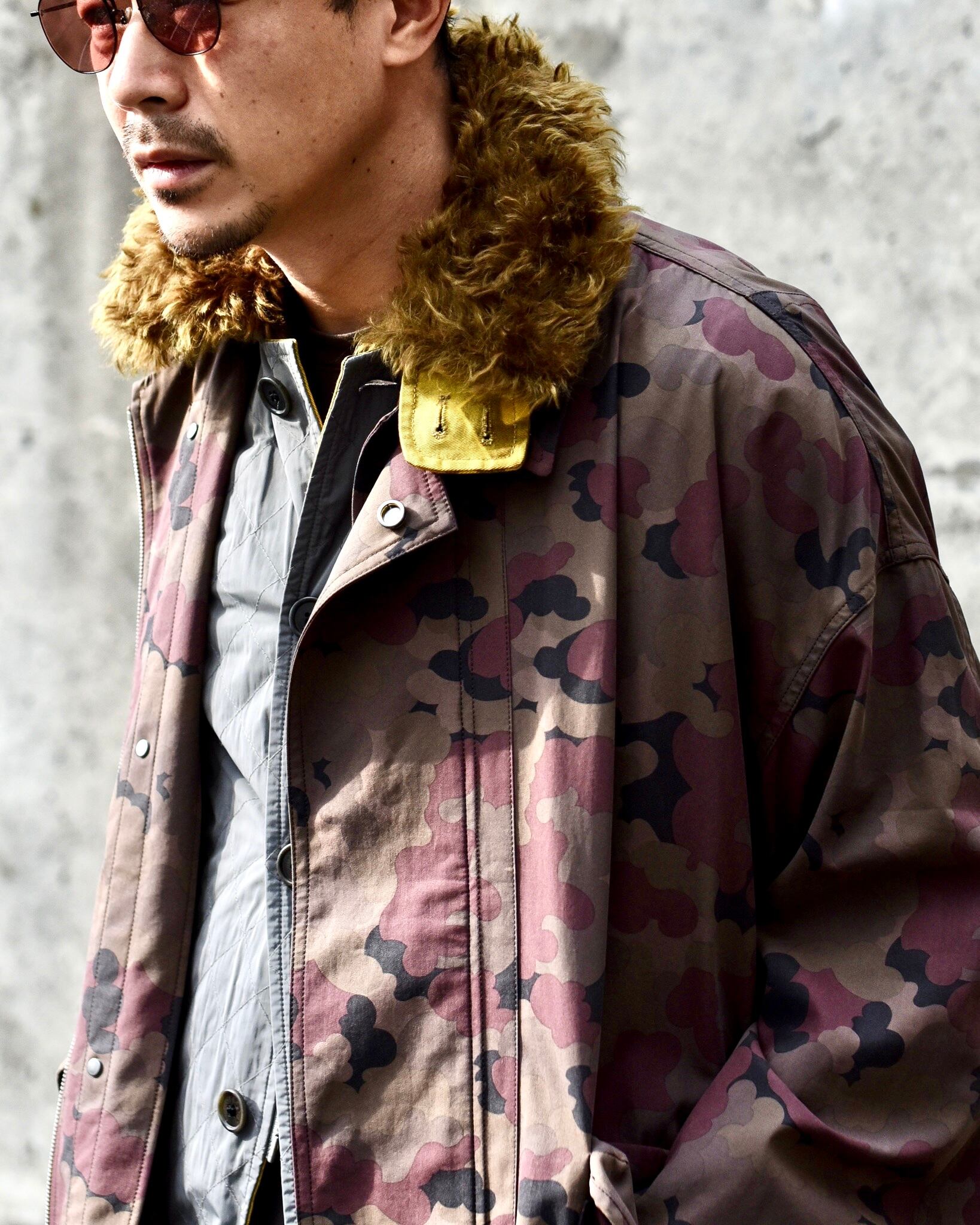 メタリックグレーの色味の高密度のポリ&コットンのキルティング生地を使用。襟にはブロンドのファー、裾やチンストラップにはイエローベースの迷彩生地を使用。