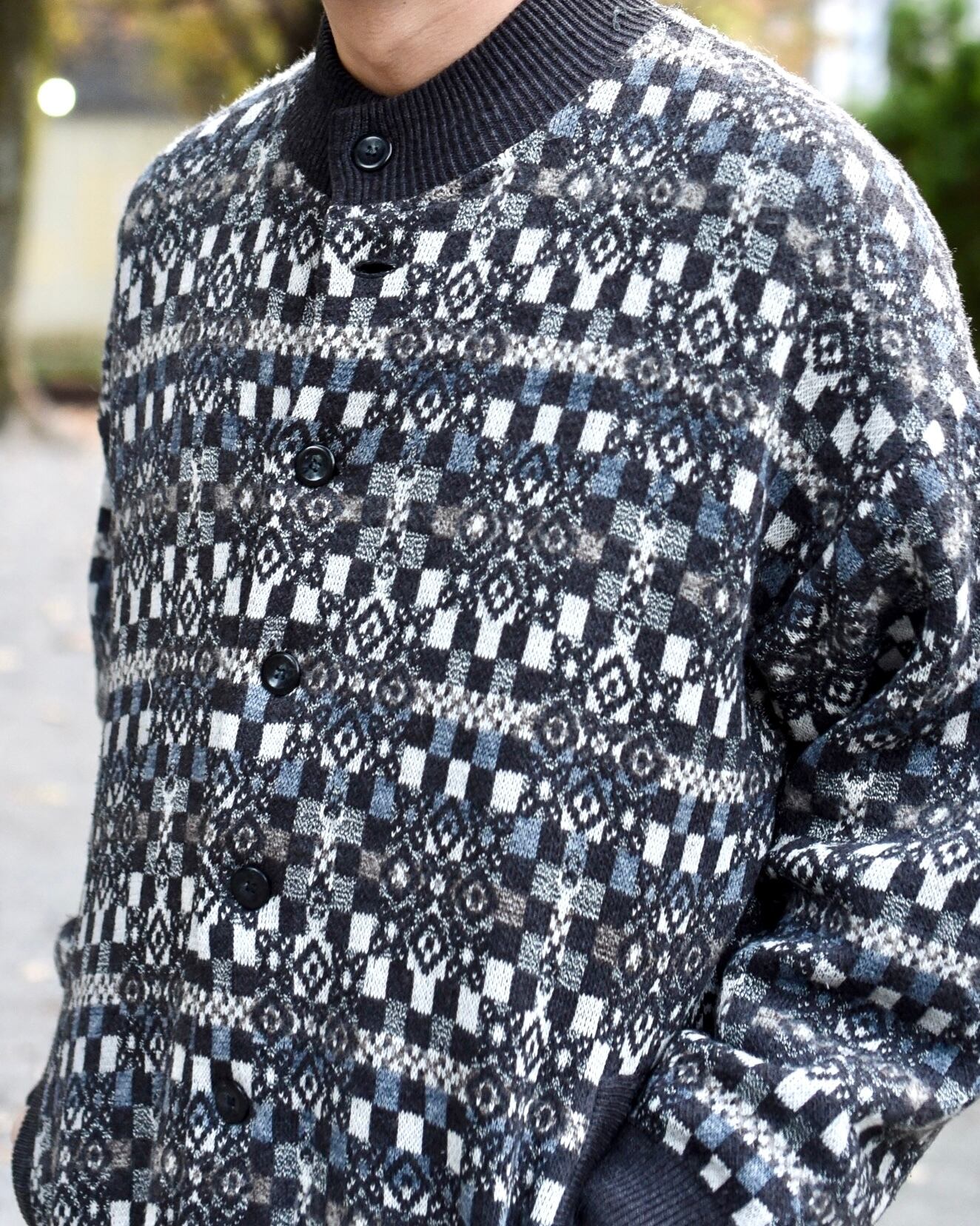 ウール&アクリルのチェックとノルディック柄を組み合わせたようなニット生地を使用。