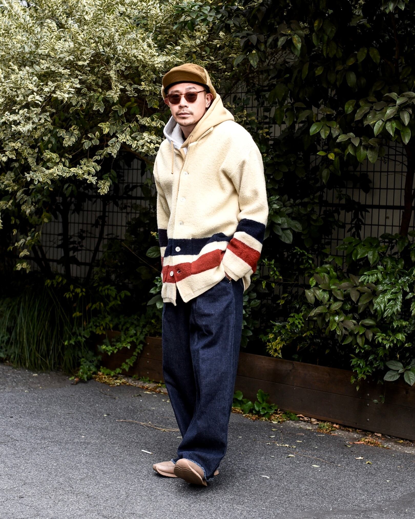 しっかりと厚手のニットの素材感で防寒性も高く、あまり見かけないようなレトロなカラーリングと変わった素材感で他にはないような雰囲気を楽しめるアイテム。