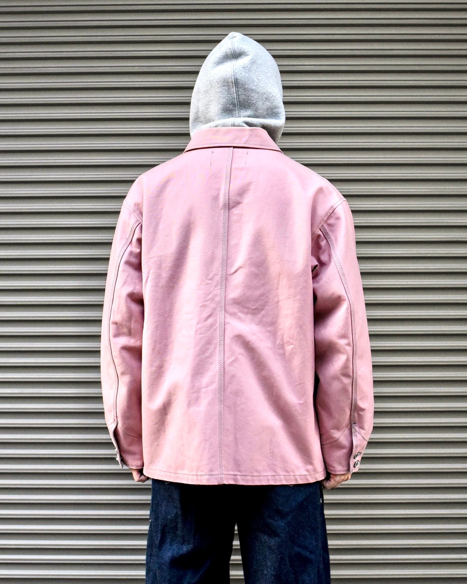 ハリ感のしっかりとあるワークなダック生地を使用していますが綺麗な薄ピンクの色味でワークになり過ぎず柔らかい印象で着用できるデザイン。
