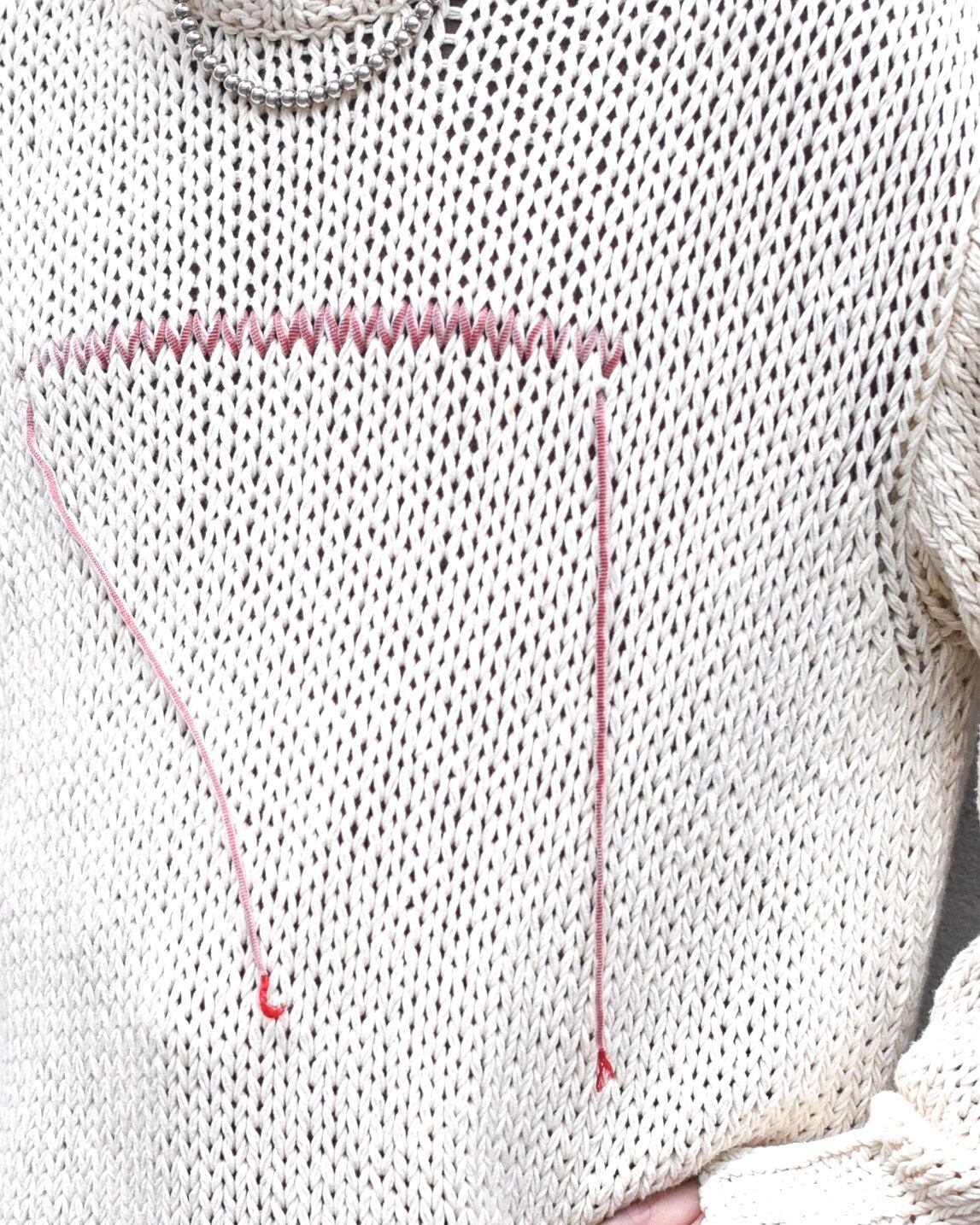 ペールホワイトの色味のコットン&アクリルのローゲージ織りのニット生地を使用。