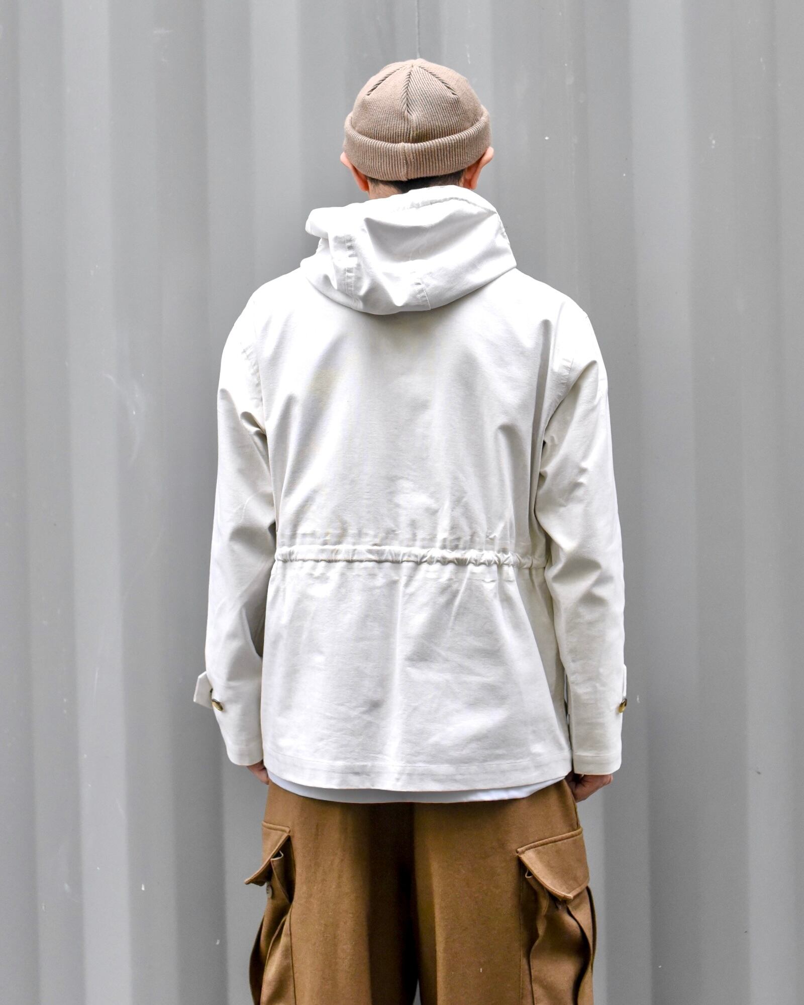 Soe Shirtのナチュラルホワイトの色味のコットンのキャンバス生地を使用したマウンテンパーカー。