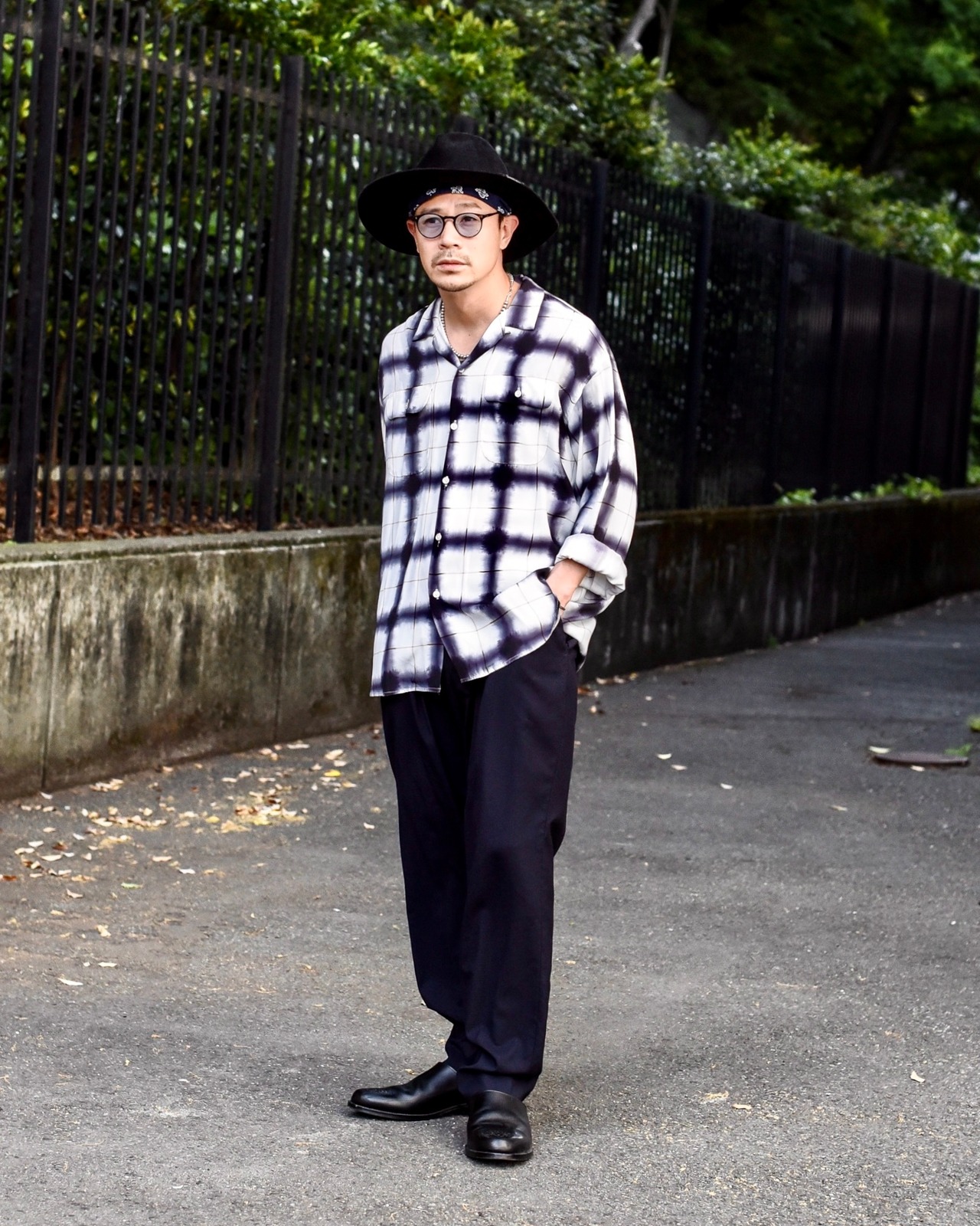オープンカラーのネックにやや身幅広めのワイドフィットのシルエット。