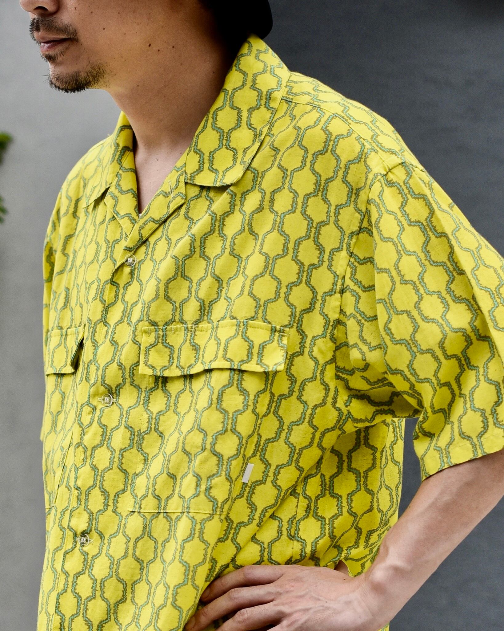 蛍光イエローにブルーをアクセントにしたオリジナルのグラフィックがプリントされたレーヨン&コットンの程良くハリがあり、トロミもある生地を使用。