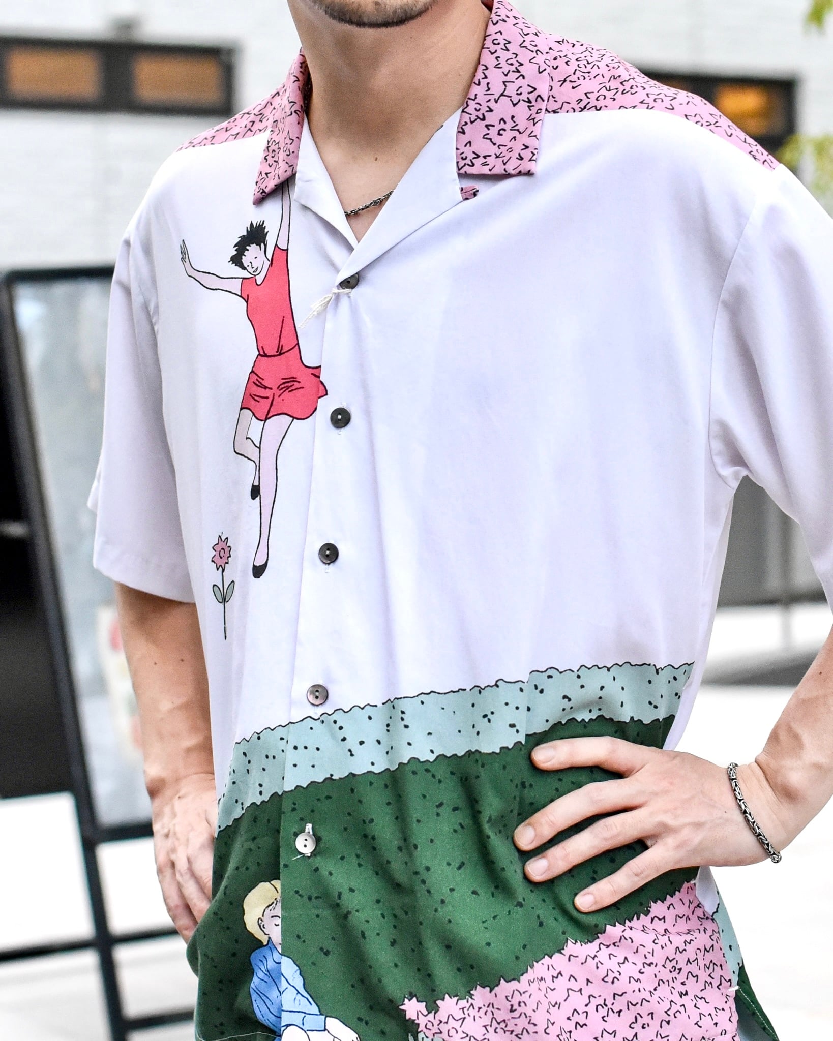 レトロでファンシーな独特のプリントの世界観が面白く、他の柄シャツとはまた異なる雰囲気を楽しめるアイテム。