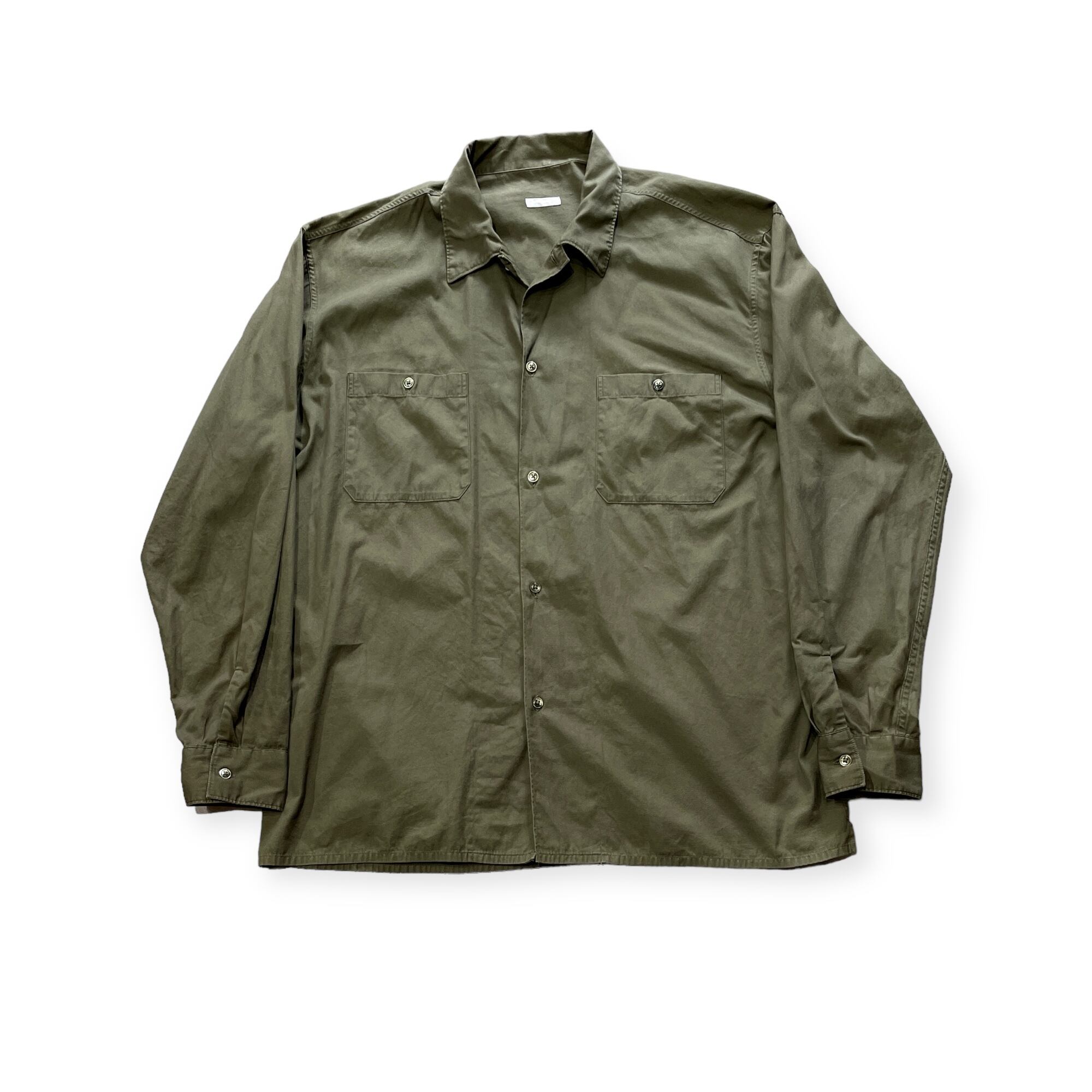 古着のミリタリーシャツをモチーフに旧式の織り機で織られたオリーブの色味のコットン100のクタっとした質感のシャツ地を使用。