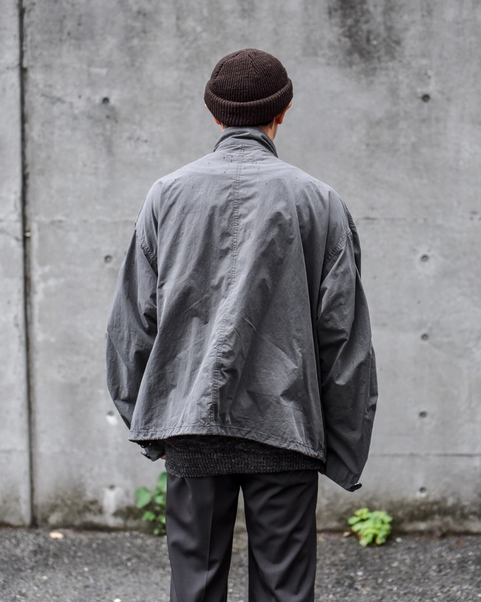 スタンドのネックにフロントはスナップボタンとジップアップで開閉ができ、裾にはドローコードの付いた丈は短めのワイドフィットのシルエット。