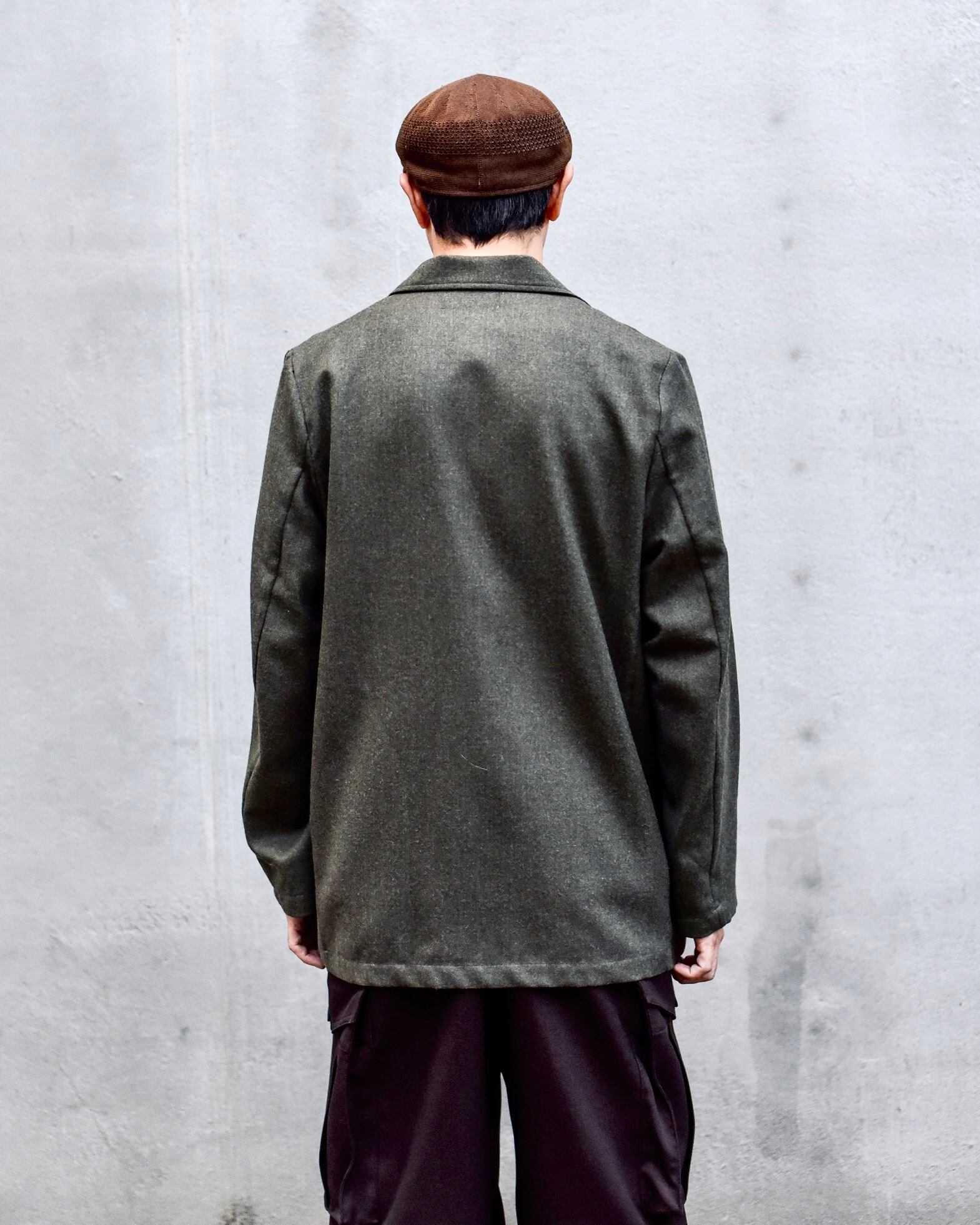 オリーブの色味の起毛感があり柔らかな質感のウールサージ生地を使用。