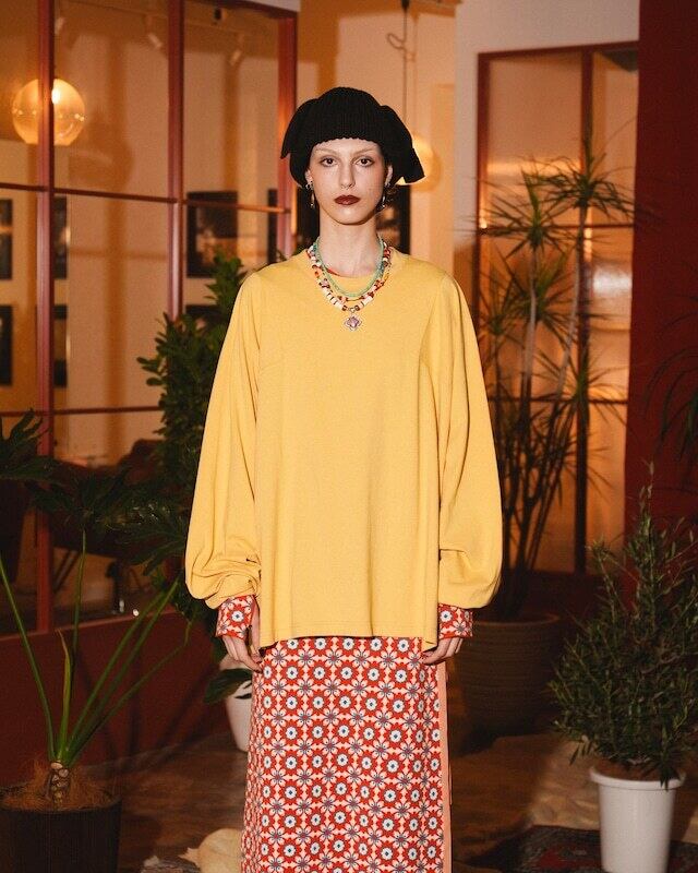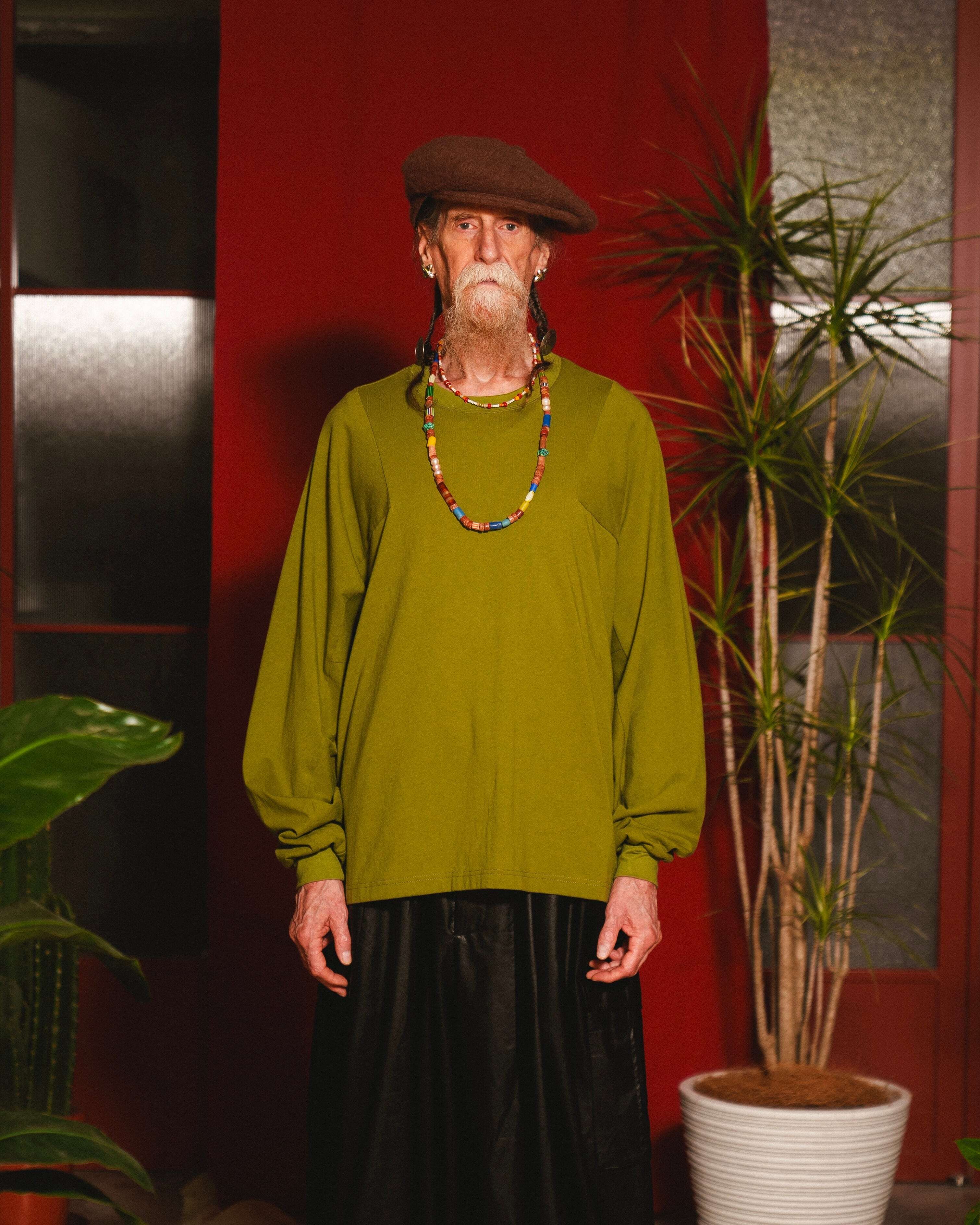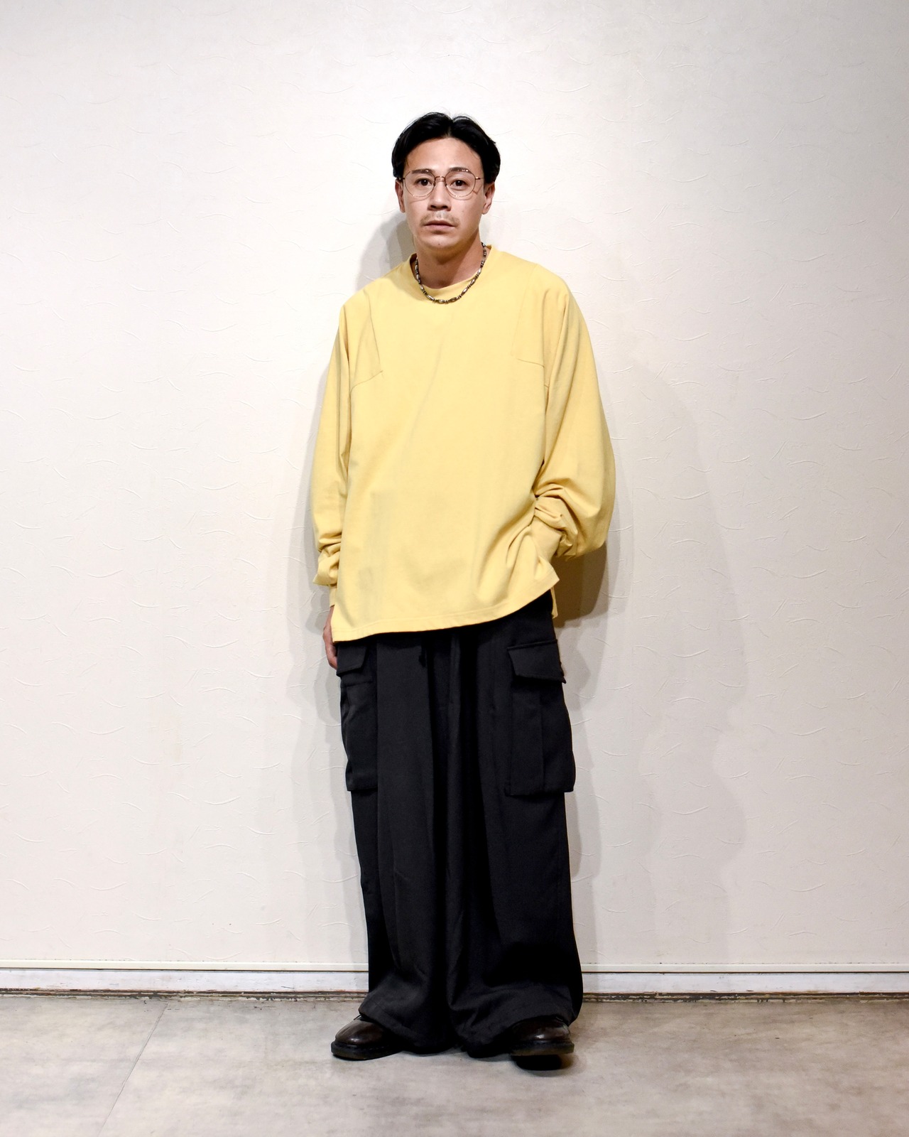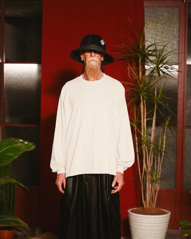 素材は薄手でしなやかな質感のカットソー生地を使用しており、肩に沿って落ちるようなドレープ感のあるユニセックスなシルエットが出るのが特徴。